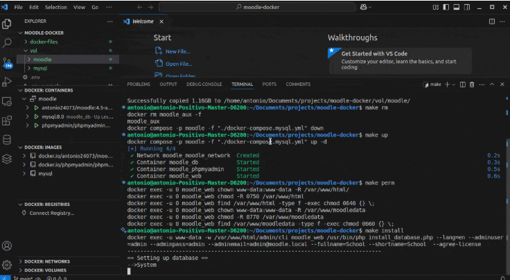 Segue abaixo um exemplo, com apenas 5 comandos efetua uma instalação bem complicada do Moodle 4.5 que demoraria dias para fazer funcionar direitinho e provavelmente o desenvolvedor ia esquecer como fez para repetir a instalação em outro ambiente. Ao lado você pode ver cada container isolando perfeitamente as aplicações.